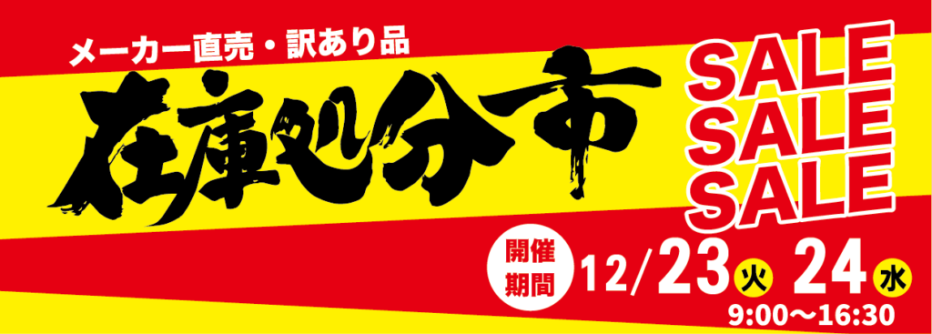 2025年12月23日、24日の2日間。(株)服部 本社(尼崎市)にて、在庫処分市を開催致します。普段よりお得な価格で商品をご提供いたしますので、ぜひこの機会にお立ち寄りください。